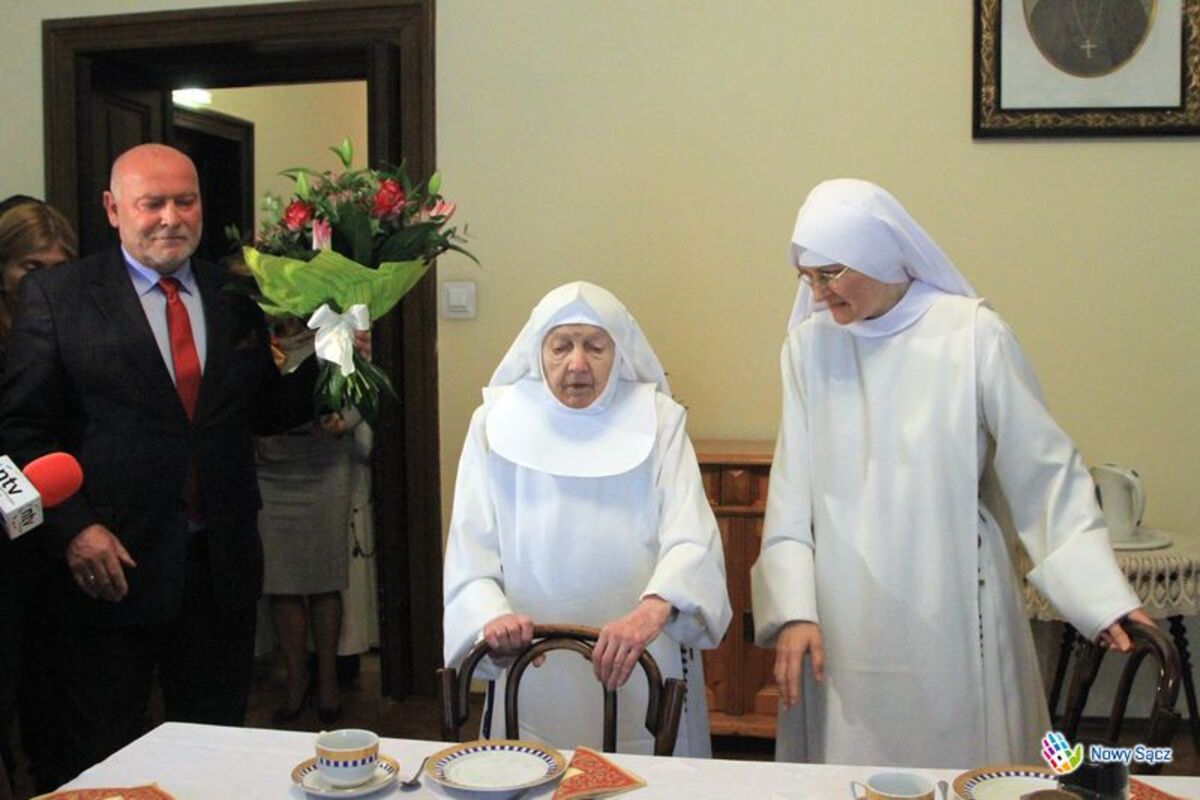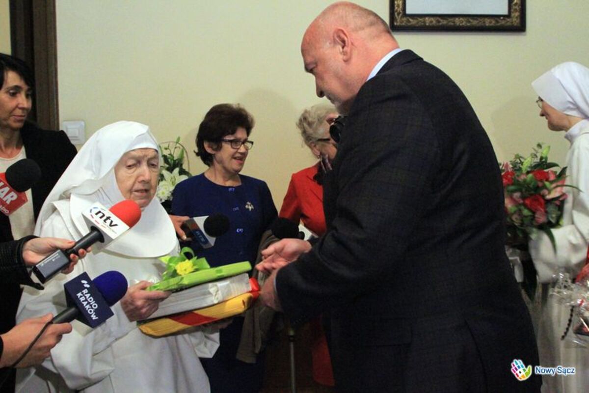 Kwiaty i upominki wręczyła jubilatce także przewodnicząca Rady Miasta Nowego Sącza Bożena Jawor. - Z ogromną radością tutaj przychodzę i cieszę się, że zastaję siostrę w takim wspaniałym zdrowiu – powiedziała przewodnicząca. – Jest siostra przykładem, jak należy brać radość życia. Tego się powinniśmy od siostry uczyć.