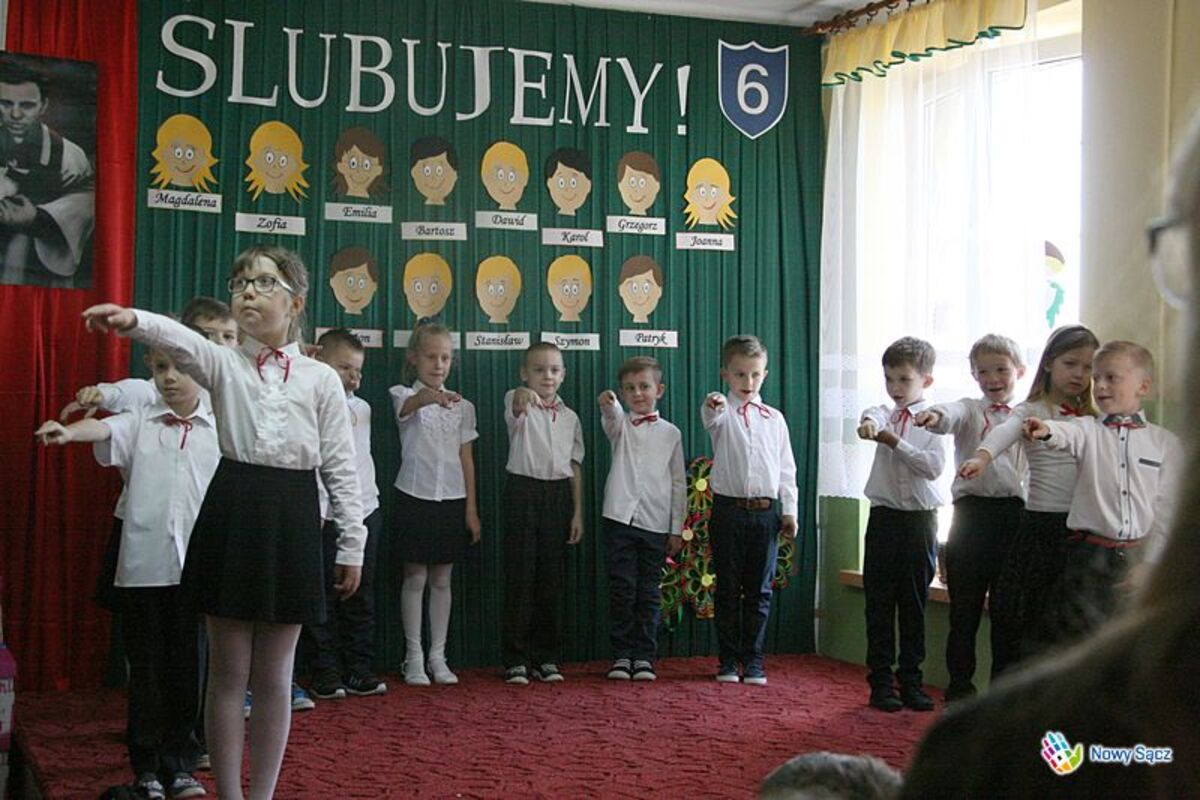 Drugą część uroczystości stanowiło ślubowanie uczniów klas pierwszych, którzy przyrzekali patronowi szkoły ks. Jerzemu Popiełuszce pilną naukę i dobre zachowanie. Zastępca prezydenta okazałym ołówkiem pasował pierwszaków na ucznia, a symbolicznym znakiem pasowania było uderzenie w dzwon poświęcony patronowi szkoły.