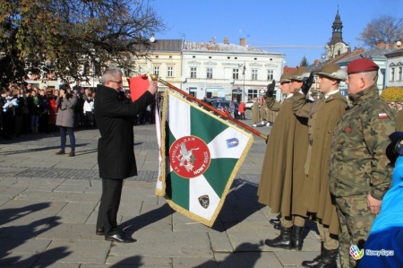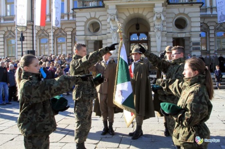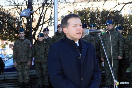 Gratulacje i podziękowania młodym strzelcom złożył zastępca prezydenta Wojciech Piech. - To wielki, piękny dzień, ponieważ dzisiaj składacie ślubowanie, poświadczacie publicznie wobec innych swoje przywiązania do najważniejszych wartości, jakie kryją się za tradycją ruchu strzeleckiego. Takich jak ojczyzna, niepodległość, wierność i honor. Dziękuje wam za to, że podjęliście tę decyzję, która mam nadzieję, będzie miała swój dalszy ciąg w waszym życiu. Chciałbym, żebyście równie skutecznie, jak czyniliście to w szkole, jak czynicie to na manewrach, słyszymy o waszych sukcesach, żebyście podobne sukcesy odnosili później w życiu. Jesteście dla nas nadzieją i gwarancją przyszłego bezpieczeństwa. Jesteście ostoją w trudnych czasach, które mamy nadzieję, że nie nadejdą. Jesteście krwią z krwi i kością z kości tej ziemi i tej społeczności. Jesteście dowodem tego, że patriotyzm przetrwał długie lata zaborów, przetrwał lata dwóch wojen światowych, przetrwał kilkadziesiąt lat sowieckiej dominacji. Jesteście dowodem patriotycznego wychowania waszych dziadków i rodziców za co im serdecznie dziękuję. W imieniu prezydenta miasta Ryszarda Nowaka chciałbym wam życzyć determinacji, wytrwałości, codziennych zwycięstw nad sobą, swoimi słabościami i wyzwaniami, które przyniesie życie – powiedział Wojciech Piech.