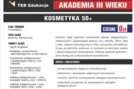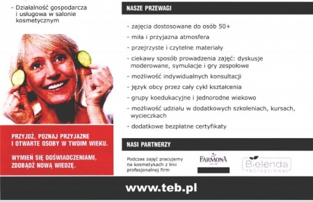 Wbrew obiegowym opiniom, w wieku 50+ także można, a nawet trzeba się uczyć. TEB Edukacja oferuje seniorom bezpłatną naukę i zdobycie dyplomu technika w poszukiwanych zawodach: florysta i technik usług kosmetycznych. Nauka rozpoczyna się w lutym bieżącego roku.