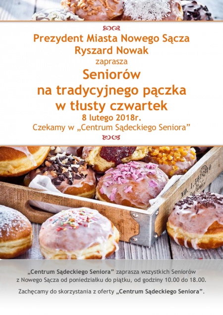 Prezydent Nowego Sącza Ryszard Nowak zaprasza Seniorów na tradycyjnego pączka w tłusty czwartek (8 lutego). Słodkości będą czekały w "Centrum Sądeckiego Seniora" przy ul. Jagiellońskiej 8, w dawnych pomieszczeniach Biura Wystaw Artystycznych.