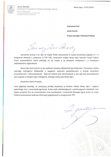 Zastępca prezydenta Jerzy Gwiżdż wystosował pismo do prezesa Zarządu Telewizji Polskiej Jacka Kurskiego. Dokument dotyczył okazania na mapie Polski Nowego Sącza w czasie prezentacji pogody w 1 i 2 programie telewizji.