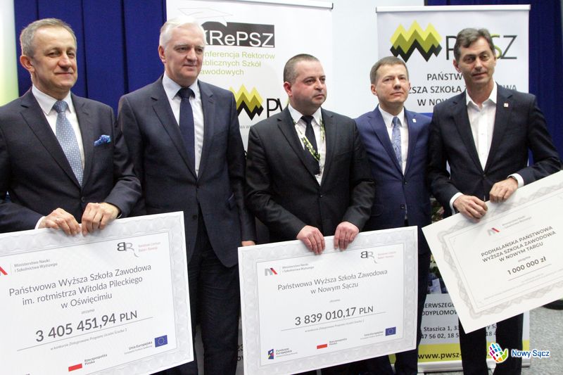Wicepremier wręczył rektorowi Państwowej Wyższej Szkoły Zawodowej w Nowym Sączu, drowi hab. Mariuszowi Cygnarowi, czek w wysokości ponad 3,8 mln złotych na rozwój uczelni. Symboliczne czeki otrzymali także rektorzy wyższych uczelni zawodowych w Oświęcimiu, Tarnowie i Nowym Targu.