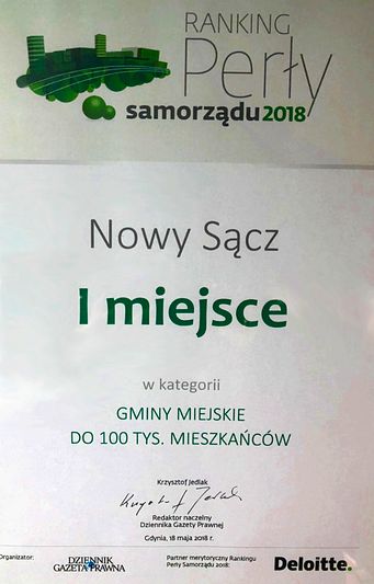 Niekwestionowanym liderem rankingu w kategorii gmin miejskich do 100 tysięcy mieszkańców zostało Miasto Nowy Sącz, zdobywając I miejsce. Perła Samorządu trafiła do Prezydenta Miasta Nowego Sącza Ryszarda Nowaka, który został najlepszym włodarzem.