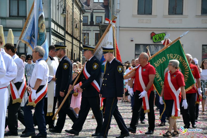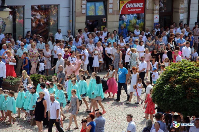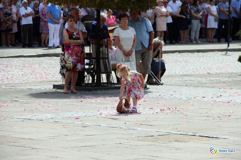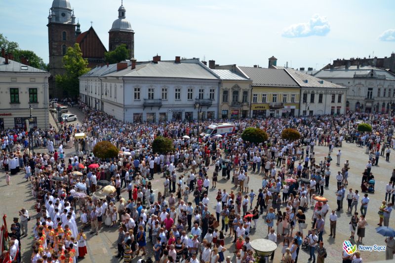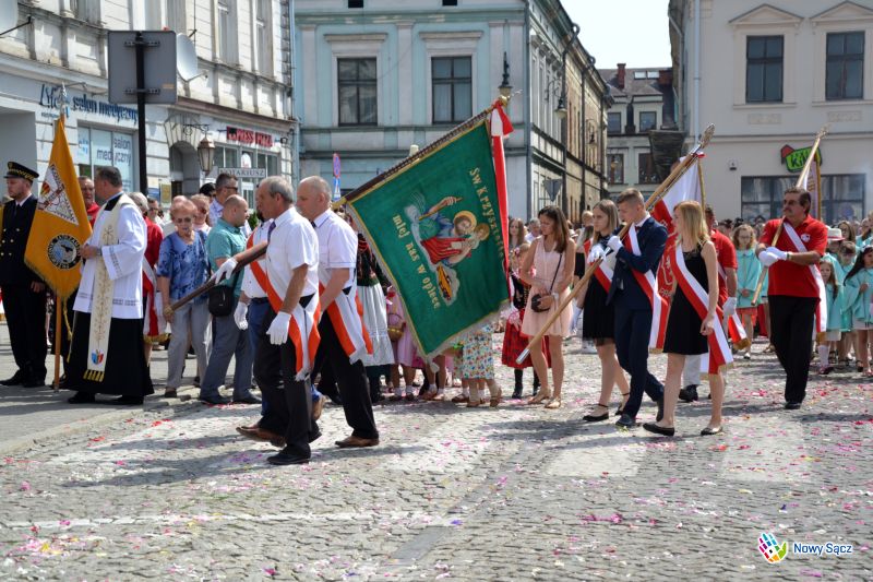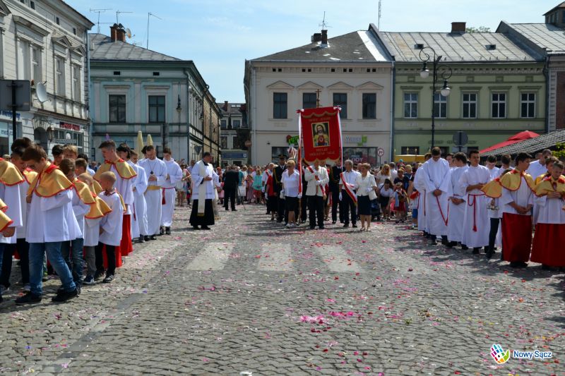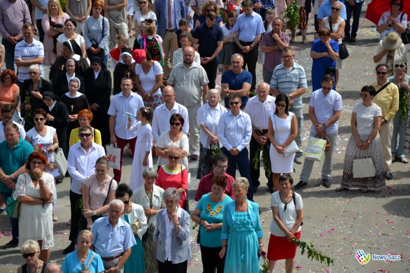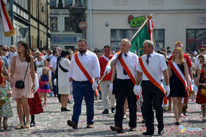 W procesji w Nowym Sączu uczestniczyli księża ze wszystkich miejskich parafii, poczty sztandarowe różnych instytucji oraz między innymi dzieci: ministranci, dzieci, które w tym roku po raz pierwszy przyjęły Komunię Świętą, dziewczynki sypiące kwiaty i chłopcy z dzwonkami.