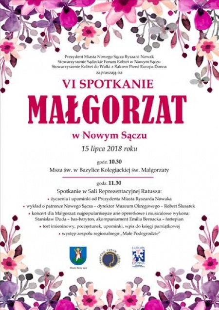 15 lipca w Nowym Sączu spotkają się imienniczki patronki miasta – świętej Małgorzaty. Panie noszące to imię, zostały zaproszone na wspólne spotkanie już po raz szósty przez prezydenta miasta Ryszarda Nowaka oraz sądeckie organizacje: Forum Kobiet i Europa Donna.