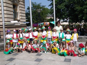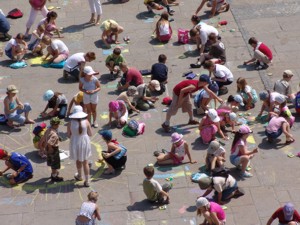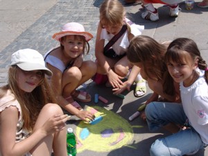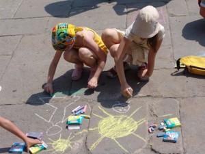 Dzieci, uzbrojone w kolorowe kredki, zabrały się do wielkiego malowania na płycie Rynku. Motywem przewodnim były oczywiście zbliżające się wakacje i słońce.
