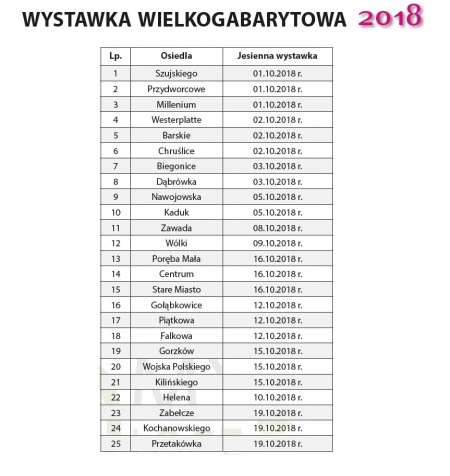 Celem "wystawki" jest ułatwienie mieszkańcom pozbycia się, bez ponoszenia dodatkowych kosztów, wielkogabarytowych przedmiotów, które nie mieszczą się do pojemników na odpady. Wystawka rozpocznie się 1 października na osiedlu Szujskiego, a zakończy się 19 października na Przetakówce.