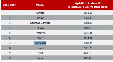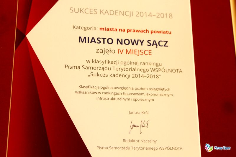 Miasto Nowy Sącz zajęło IV miejsce w klasyfikacji ogólnej rankingu Pisma Samorządu Terytorialnego WSPÓLNOTA „Sukces kadencji 2014 – 2018”. VII lokata przypadła Nowemu Sączowi w innym rankingu tego pisma, podsumowującym wydatki inwestycyjne finansowane ze środków Unii Europejskiej w latach 2014 – 2017.