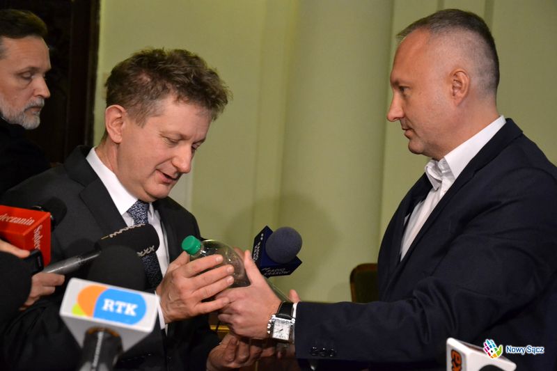 - Podstawowe zadanie, które stawiam przed dyrektorem Wydziału Ochrony Środowiska, to przedstawienie kompleksowego planu walki o czyste powietrze. To muszą być działania wielowątkowe: nie tylko wymiana pieców, rozbudowa sieci ciepłowniczej, ale także przechodzenie na elektromobilność. To, co możemy zrobić teraz i prowadzę już w tej sprawie rozmowy, to monitorowanie kwestii spalania śmieci. Przecież jesteśmy coraz bardziej świadomi tego, że nie wolno palić śmieci, ale wąska grupa ludzi, która to robi, przyczynia się do tego, że czynniki rakotwórcze pojawiają się w powietrzu. Musimy zadbać o to, żebyśmy byli bezpieczni oddychając powietrzem w Nowym Sączu - mówiąc to, prezydent Ludomir Handzel wręczył nowemu dyrektorowi Wydziału Ochrony Środowiska Grzegorzowi Tabaszowi, symboliczną plastikową butelkę, na znak walki z paleniem śmieci.