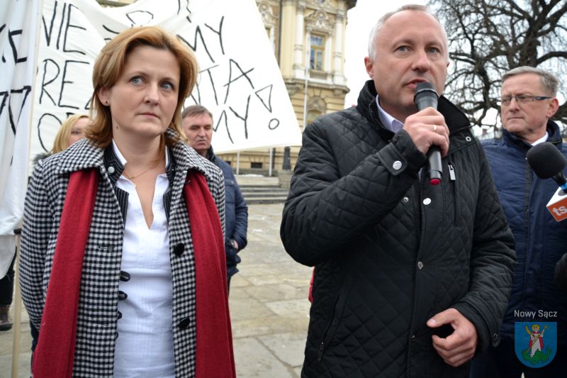 Prezydent Miasta Nowego Sącza Ludomir Handzel oraz wiceprezydent Magdalena Majka spotkali się z nauczycielami i rodzicami dzieci, uczącymi się w Szkole Podstawowej nr 1 im. Adama Mickiewicza w Nowym Sączu, którzy protestowali pod Ratuszem przeciwko likwidacji szkoły.