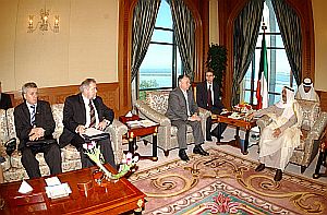 Na zdjęciu: Marszałek Bogdan Borusewicz, ambasador Kazimierz Romański i senator Stanisław Kogut na audiencji u emira Kuwejtu, szejka Sabaha al-Ahmada as-Sabaha.