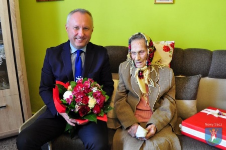 Wraz z życzeniami Prezydent Nowego Sącza przekazał pani Stefanii listy gratulacyjne od Prezesa Rady Ministrów Mateusza Morawieckiego oraz Wojewody Małopolskiego Piotra Ćwika, a także bukiet pięknych kwiatów i okolicznościowy prezent.