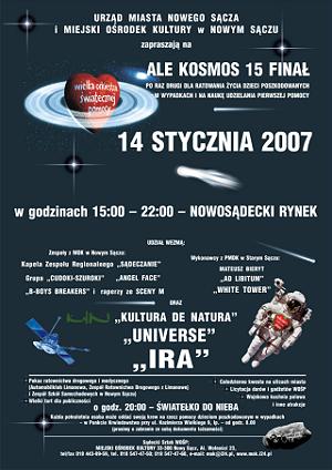 Występy zespołów regionalnych, pokazy, licytacje i koncert zespołu IRA- towarzyszyć będą XV Finałowi Wielkiej Orkiestry Świątecznej Pomocy. Impreza rozpocznie się na sądeckim rynku o godzinie 15.00. Sądeczan powitają - sztab WOŚP i władze miasta. Kilka minut później zagra kapela „SĄDECZAN” z Miejskiego Ośrodka Kultury w Nowym Sączu. Na płycie rynku pojawią się także modelarze z Klubu Modelarskiego „AERO” w Nowym Sączu, którzy w niebo wypuszcza balony przygotowane specjalnie na niedzielną imprezę. Później wystąpi grupa „CUDOKI – SZUROKI” z Miejskiego Ośrodka Kultury w Nowym Sączu. O 15.20 zaśpiewa Agnieszka Nowak, laureatka programu „Od przedszkola do Opola”
