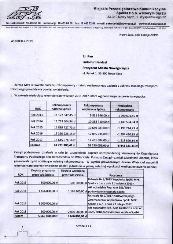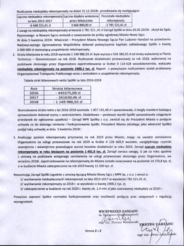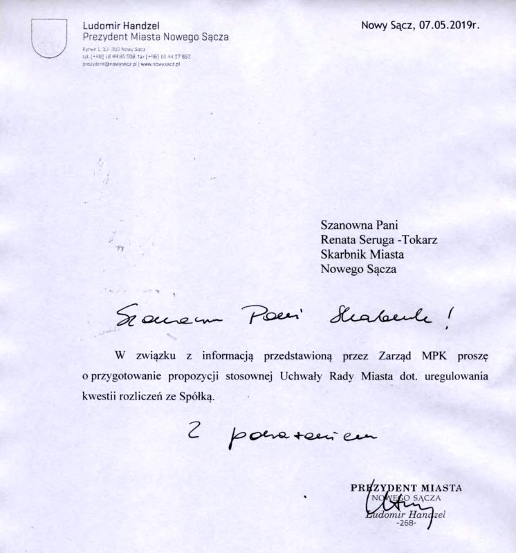 W związku z informacją przedstawioną przez Zarząd Miejskiego Przedsiębiorstwa Komunikacyjnego, Prezydent Miasta Nowego Sącza Ludomir Handzel zwrócił się z prośbą do Skarbnika Miasta Nowego Sącza o przygotowanie propozycji stosownej Uchwały Rady Miasta dot. Uregulowania kwestii rozliczeń ze Spółką.
