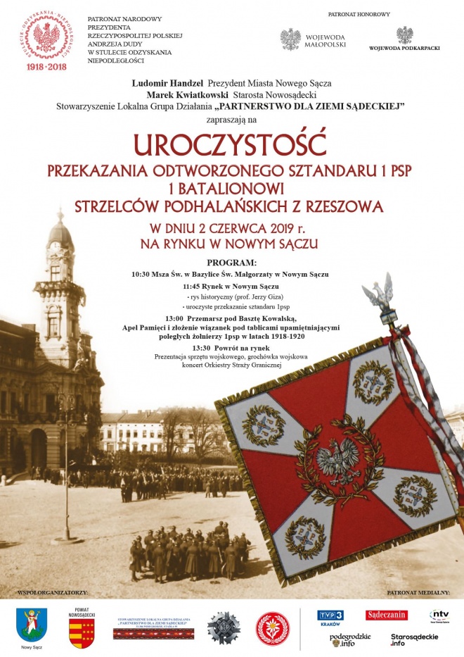 Prezydent Miasta Nowego Sącza Ludomir Handzel, Starosta Powiatu Nowosądeckiego Marek Kwiatkowski oraz Prezes Stowarzyszenia Lokalna Grupa Działania Partnerstwo dla Ziemi Sądeckiej Marek Uszko zapraszają na uroczystość przekazania I Batalionowi Strzelców Podhalańskich z Rzeszowa odtworzonego sztandaru I Pułku Strzelców Podhalańskich. Uroczystości odbędą się w Nowym Sączu 2 czerwca 2019 roku.