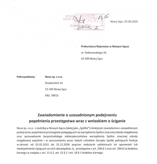 4 czerwca 2019 roku Prezes Zarządu NOVA Sp. z o.o. złożył zawiadomienie do Prokuratury Rejonowej w Nowym Sączu o uzasadnionym podejrzeniu popełnienia przestępstw, polegających na wyrządzeniu Spółce znacznej szkody majątkowej przez byłych członków Zarządu Spółki. Łączna szkoda majątkowa wyrządzona Spółce wynosi co najmniej 418 516, 45 zł.