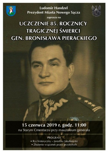 Prezydent Miasta Nowego Sącza Ludomir Handzel zaprasza mieszkańców miasta do uczczenia 85. rocznicy śmierci gen. Bronisława Pierackiego - przedwojennego ministra spraw wewnętrznych, który zginął tragicznie zastrzelony przez ukraińskiego nacjonalistę w 1934 roku. Uroczystości odbędą się 15 czerwca o godz. 11:00 na Starym Cmentarzu przy Mauzoleum Generała.
