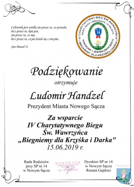 Prezydent Miasta Nowego Sącza Ludomir Hadzel otrzymał podziękowania za wsparcie IV Charytatywnego Biegu św. Wawrzyńca „Biegniemy dla Krzyśka i Darka”, który odbył się 15 czerwca 2019 roku stadionie KS Biegoniczanka. Jego organizatorem była Szkoła Podstawowa nr 14 w Nowym Sączu wraz z partnerami: Stowarzyszeniem Sursum Corda, ZS OSW Strzelec oraz OSP Biegonice.