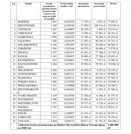 Kwoty przypadające dla każdego osiedla w ramach Budżetu Obywatelskiego Miasta Nowego Sącza na 2020 rok