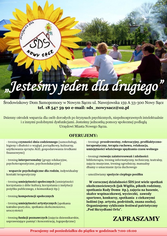 Środowiskowy Dom Samopomocy, który działa przy ulicy Nawojowskiej 159 A w Nowym Sączu, posiada wolne miejsca w dziennym ośrodku wsparcia dla osób po kryzysach psychicznych oraz niepełnosprawnych. Ośrodek czynny jest od poniedziałku do piątku w godzinach od 7:00 do 16:00. Swoim podopiecznym oferuje wiele atrakcyjnych zajęć terapeutycznych i integracyjnych.