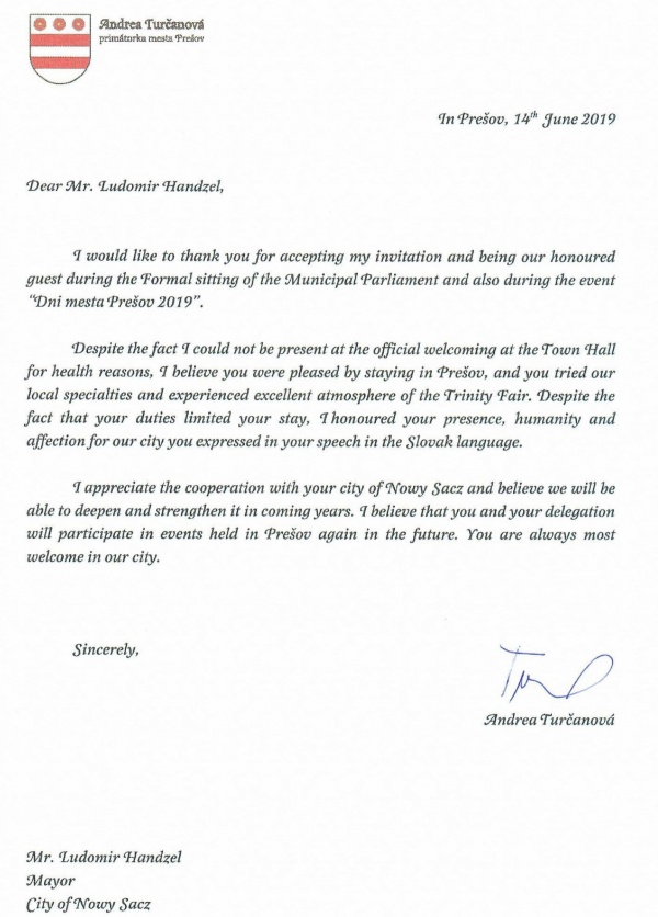 - Chciałabym podziękować za przyjęcie mojego zaproszenia i bycie honorowym gościem posiedzenia Rady Miasta Preszowa oraz Dni Miasta Preszowa 2019 – pisze burmistrz Preszowa Andrea Turčanová. – Doceniam współpracę między naszymi miastami i mam nadzieję, że w najbliższych latach będziemy mogli ją wzmocnić. Jest Pan zawsze mile widziany w naszym mieście.
