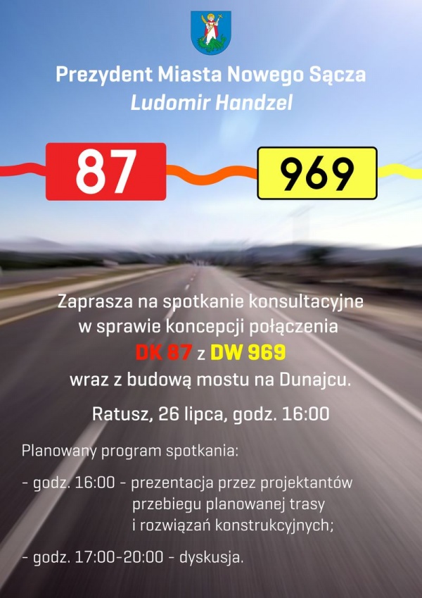 Prezydent Ludomir Handzel zaprasza na spotkanie konsultacyjne w sprawie koncepcji połączenia drogi krajowej nr 87 z drogą wojewódzką nr 969 wraz z budową mostu na Dunajcu. Spotkanie odbędzie się w ratuszu 26 lipca o godz. 16:00.