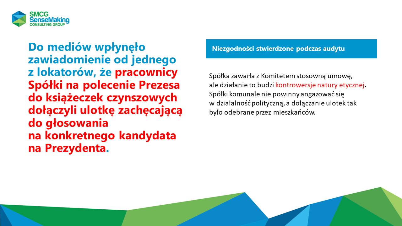 Do mediów wpłynęło zawiadomienie od jednego z lokatorów, że pracownicy Spółki na polecenie Prezesa do książeczek czynszowych dołączyli ulotkę zachęcającą do głosowania na konkretnego kandydata na Prezydenta. Spółka zawarła z Komitetem stosowną umowę, ale działanie to budzi kontrowersje natury etycznej