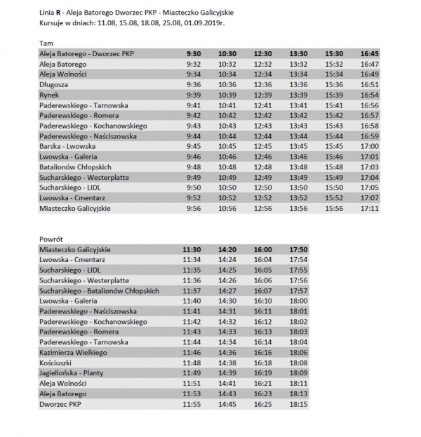 Odjazdy z Miasteczka: 11:30, 14:20, 16:00, 17:50.
