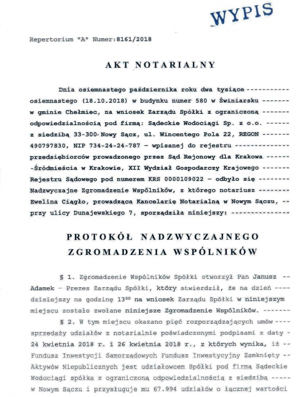 W związku z publikacją nieprawdziwych informacji na stronie internetowej jednej z sądeckich telewizji informujemy, że Nadzwyczajne Zgromadzenie Wspólników, na którym dokonano podwyższenia kapitału zakładowego Spółki, zmiany umowy Spółki i uchwalenia tekstu jednolitego Spółki, odbyło się 18 października 2018 roku.