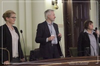 O szczegółach architektonicznych sali i ratusza opowiedział sekretarz miasta Piotr Lachowicz. Przy okazji przybliżył gościom historie i specyfikę naszego miasta, od lokacji w 1292 roku aż do czasów współczesnych. Goście interesowali się funkcjonowaniem Urzędu miasta (na przykład kontakty z obywatelami) i problemami miasta. Po części studyjnej goście otrzymali pamiątkowe gadżety.
