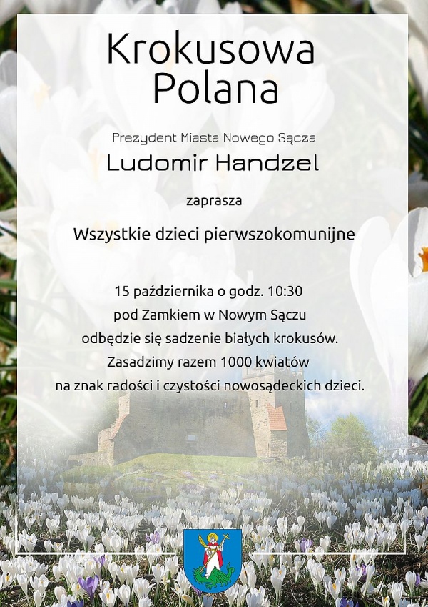 Prezydent Nowego Sącza Ludomir Handzel zaprasza wszystkie dzieci pierwszokomunijne pod Zamek. 15 października (wtorek) o godz. 10:30 odbędzie się tam sadzenie białych krokusów. "Zasadzimy razem tysiąc kwiatów na znak radości nowosądeckich dzieci" - zapowiadają organizatorzy wydarzenia.