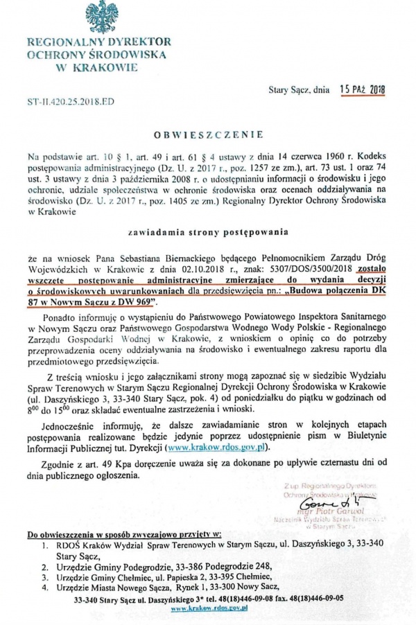 Dnia 15 października 2018 roku, a więc jeszcze przed rozpoczęciem nowej kadencji przez prezydenta Ludomira Handzla, po pozytywnym zaopiniowaniu wariantu ‘’C” przez wszystkie zainteresowane samorządy, Regionalny Dyrektor Ochrony Środowiska, na wniosek Zarządu Dróg Wojewódzkich w Krakowie wszczął postępowanie administracyjne, zmierzające do wydania decyzji o środowiskowych uwarunkowaniach dla przedsięwzięcia pn: „Budowa połączenia DK 87 w Nowym Sączu z DW 969”.