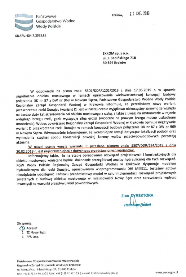 Ponadto Państwowe Gospodarstwo Wodne Wody Polskie w piśmie z dnia 24 czerwca 2019 roku, również uznało, że wariant ’’C” jest najkorzystniejszym z dotychczas prezentowanych wariantów.