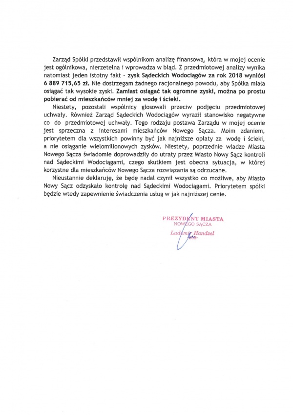 W swoim oświadczeniu Prezydent Ludomir Handzel odniósł się do formułowanych w przestrzeni publicznej twierdzeń Zarządu Sądeckich Wodociągów sp. z o.o., które mogą wprowadzać w błąd opinię publiczną. Prezydent podkreślił również, że proponowane przez niego utworzenie kapitału rezerwowego, pozwoliłoby na zachowanie opłat uiszczanych przez odbiorców w Nowym Sączu na dotychczasowym poziomie, dając Zarządowi odpowiednie narzędzia formalno-prawne w tym zakresie.