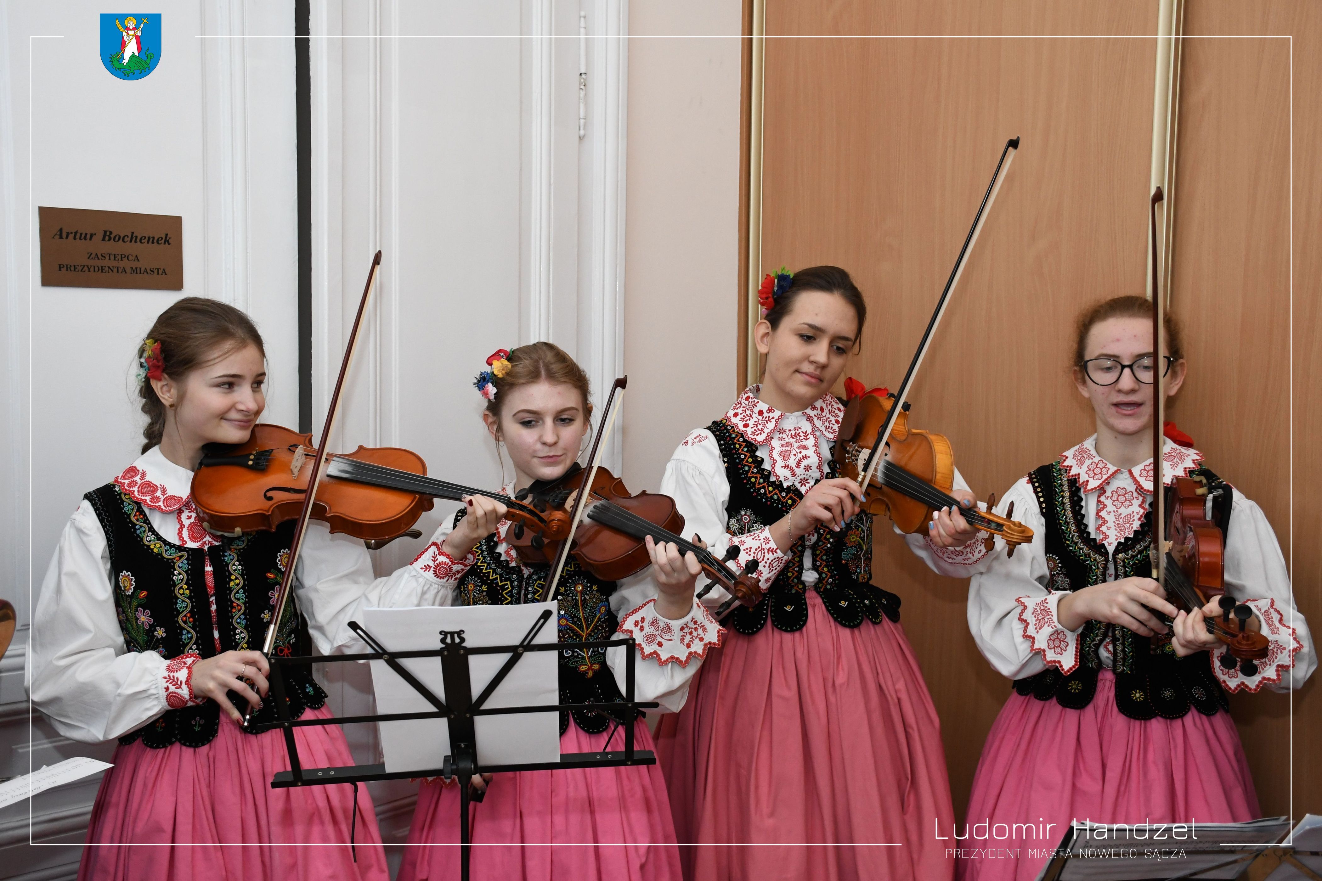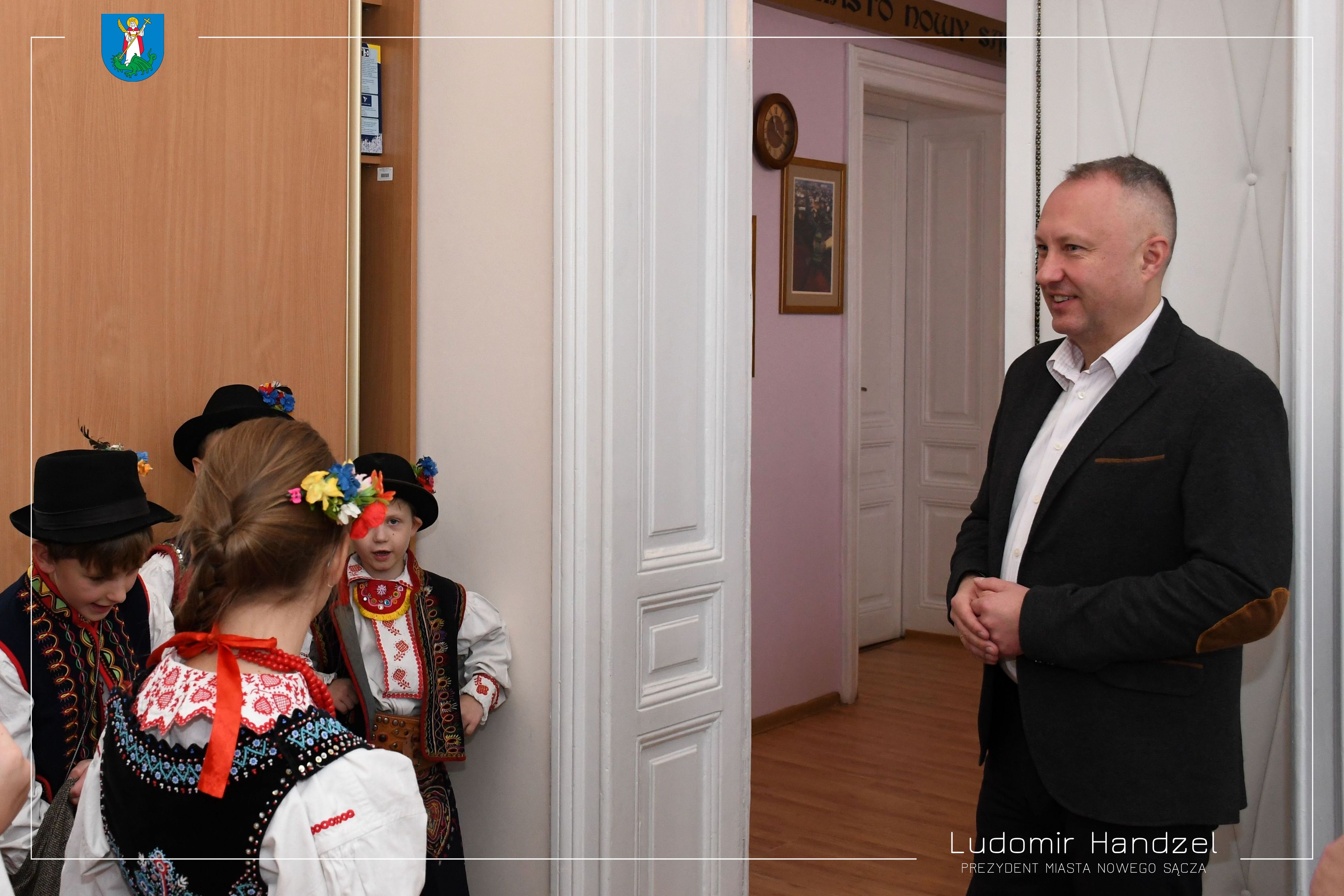 Podopieczni Pałacu Młodzieży w Nowym Sączu odwiedzili prezydenta Ludomira Handzla. Ubrani w stroje ludowe młodzi artyści, złożyli świąteczne życzenia, a w Ratuszu rozbrzmiały najpiękniejsze polskie kolędy. Prezydent podziękował za wizytę i wręczył kolędującym słodkie prezenty.