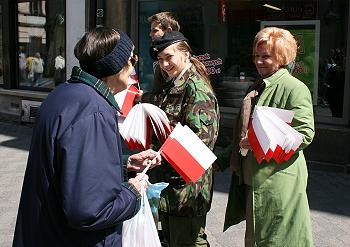 W dniu dzisiejszym symbole Flagi Narodowej rozdawali mieszkańcom miasta: zastępcy prezydenta i harcerze. Wiceprezydent Bożena Jawor spotkała się z mieszkańcami miasta, na ulicy Jagiellońskiej. Sądeczanie z wielką życzliwością i zainteresowaniem podchodzili do pani wiceprezydent, kilka osób skorzystało z okazji by podziękować władzom miasta za pielęgnowanie polskich tradycji.