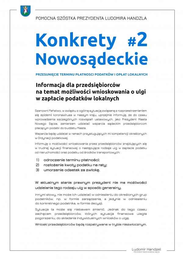 W związku z ogólną sytuacją związaną z rozprzestrzenianiem się epidemii koronawirusa w naszym kraju, uprzejmie informujemy, że do czasu wprowadzenia szczególnych rozwiązań ustawowych, Prezydent Miasta Nowego Sącza, zamierza udzielać wsparcia sądeckim przedsiębiorcom płacącym podatki do budżetu Miasta. Wsparcie będzie udzielane w ramach przysługujących prezydentowi kompetencji określonych w Ordynacji podatkowej.