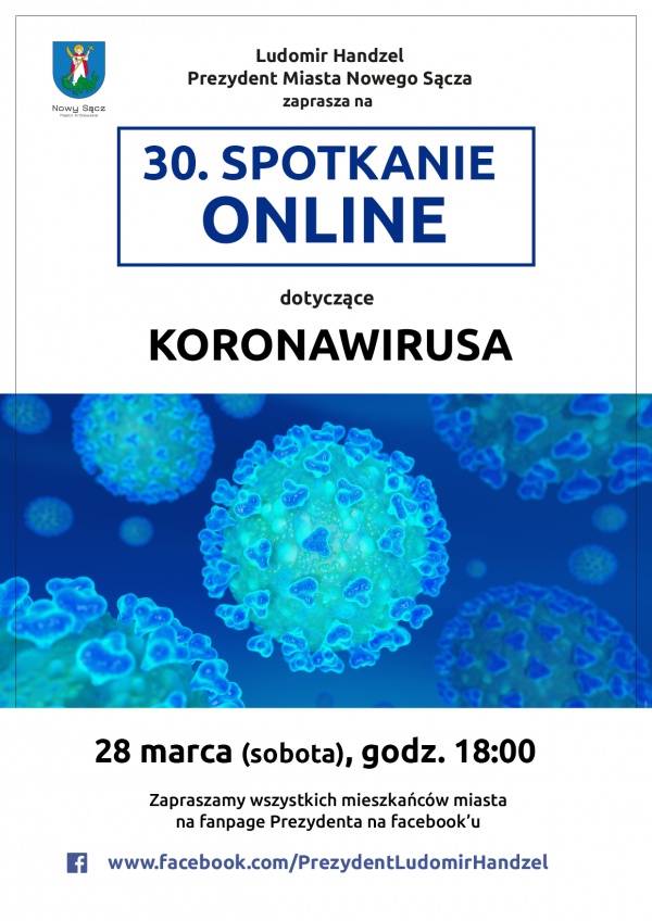 Prezydent Ludomir Handzel zaprasza wszystkich mieszkańców na spotkanie on-line. Omówiona zostanie aktualna sytuacja epidemiologiczna, związana z pandemią Koronawirusa. Zapraszamy na fanpage prezydenta, na facebook w sobotę (28 marca) o godz. 18:00.