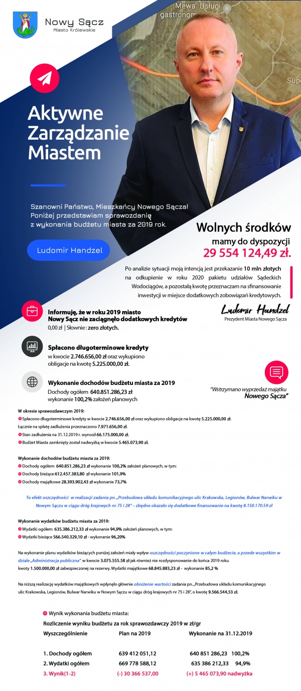 Rok 2019 był bardzo dobrym rokiem dla budżetu Miasta Nowego Sącza. Dzięki staraniom prezydenta Ludomir Handzla, budżet Miasta został zamknięty nadwyżką w kwocie ponad 5 milionów złotych. Wolnych środków do dyspozycji jest prawie 30 milionów.