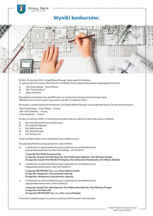 10 stycznia 2020 r. Urząd Miasta Nowego Sącza ogłosił 3 konkursy na opracowanie koncepcji urbanistyczno-architektonicznej zagospodarowania następujących terenów:
