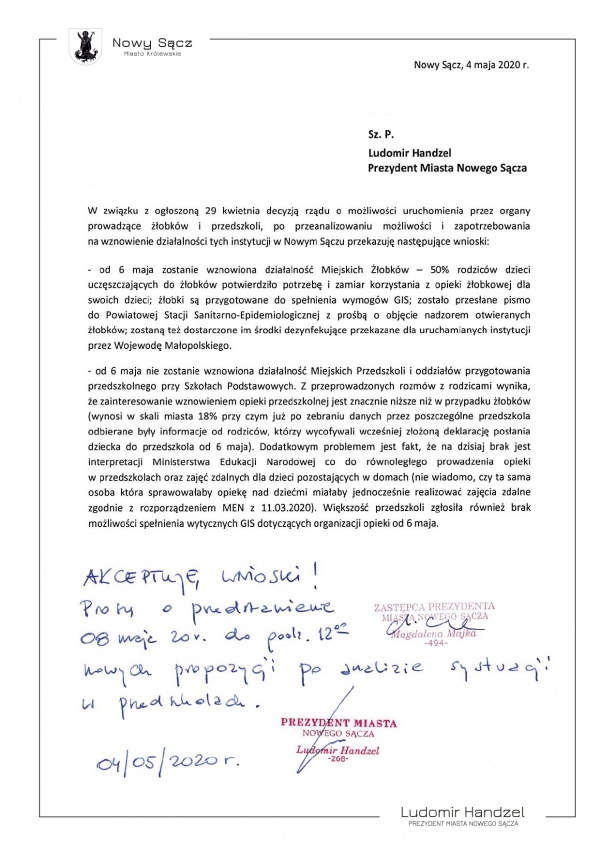 - Przedszkola miejskie na razie zamknięte – w wielu placówkach żaden rodzic nie deklaruje przysyłania dzieci – będziemy dynamicznie reagować na sytuację - powiedział prezydent Ludomir Handzel.