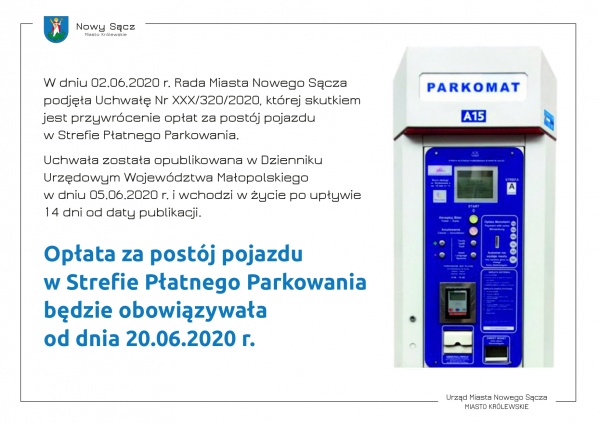 W dniu 02.06.2020r. Rada Miasta Nowego Sącza podjęła Uchwałę Nr XXX/320/2020, której skutkiem jest przywrócenie opłat za postój pojazdu w Strefie Płatnego Parkowania. Uchwała została opublikowana w Dzienniku Urzędowym Województwa Małopolskiego w dniu 05.06.2020 r. i wchodzi w życie po upływie 14 dni od daty publikacji. Opłata za postój pojazdu w Strefie Płatnego Parkowania będzie obowiązywała od dnia 20.06.2020 r.