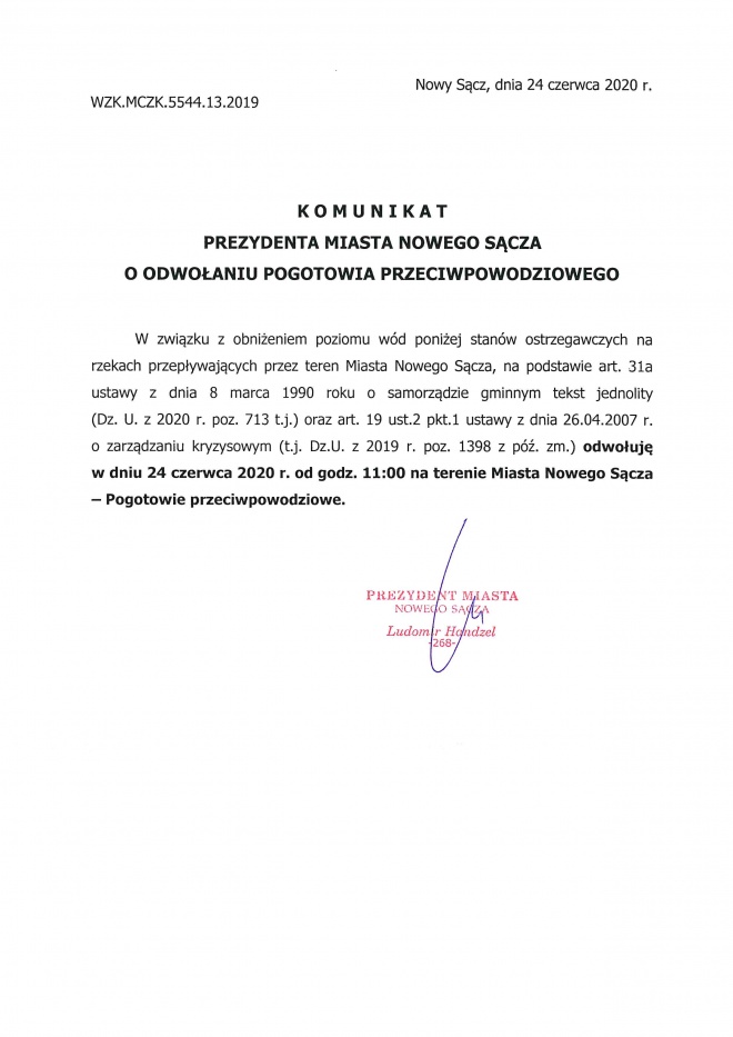 W związku z obniżeniem poziomu wód poniżej stanów ostrzegawczych na rzekach przepływających przez teren Miasta Nowego Sącza, Prezydent Miasta Ludomir Handzel odwołuje w dniu 24 czerwca na terenie Nowego Sącza Pogotowie przeciwpowodziowe.