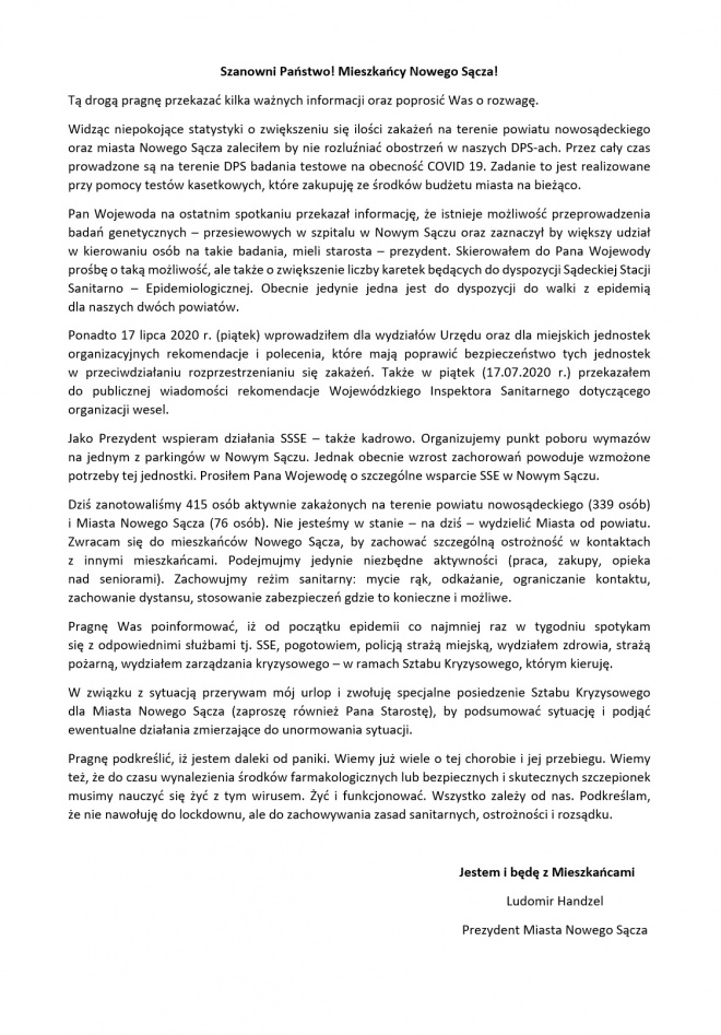 Szanowni Państwo! Mieszkańcy Nowego Sącza!