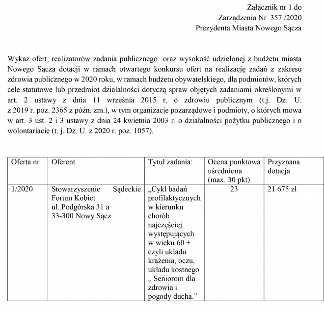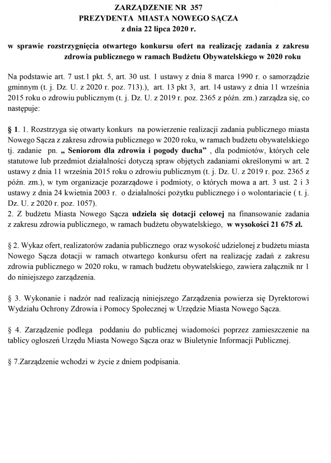 Zarządzenie Prezydenta Miasta Nowego Sącza Nr 357/2020 z dnia 22 lipca 2020 r. w sprawie rozstrzygnięcia otwartego konkursu ofert na realizację zadania z zakresu zdrowia publicznego w ramach Budżetu Obywatelskiego w 2020 roku.