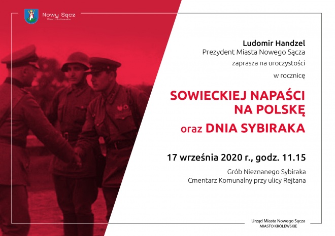 Prezydent Miasta Nowego Sącza Ludomir Handzel zaprasza na uroczystości w rocznicę sowieckiej napaści na Polskę oraz Dnia Sybiraka, które odbędą się 17 września 2020 r. godz. 11.15 przy Grobie Nieznanego Sybiraka na cmentarzu komunalnym przy ulicy Rejtana.