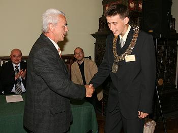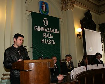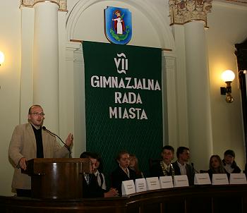 W sali reprezentacyjnej sądeckiego ratusza obradowała VII Gimnazjalna Rada Miasta. Jak przystało na obrady radnych, za stołem prezydialnym zasiadł przewodniczący wraz ze swoimi zastępcami. Wiceprzewodniczący Rady Miasta – Stefan Chomoncik przekazał w ręce gimnazjalistów insygnia władzy – ozdobny łańcuch przewodniczącego Rady Miasta i rozpoczęto obrady.
