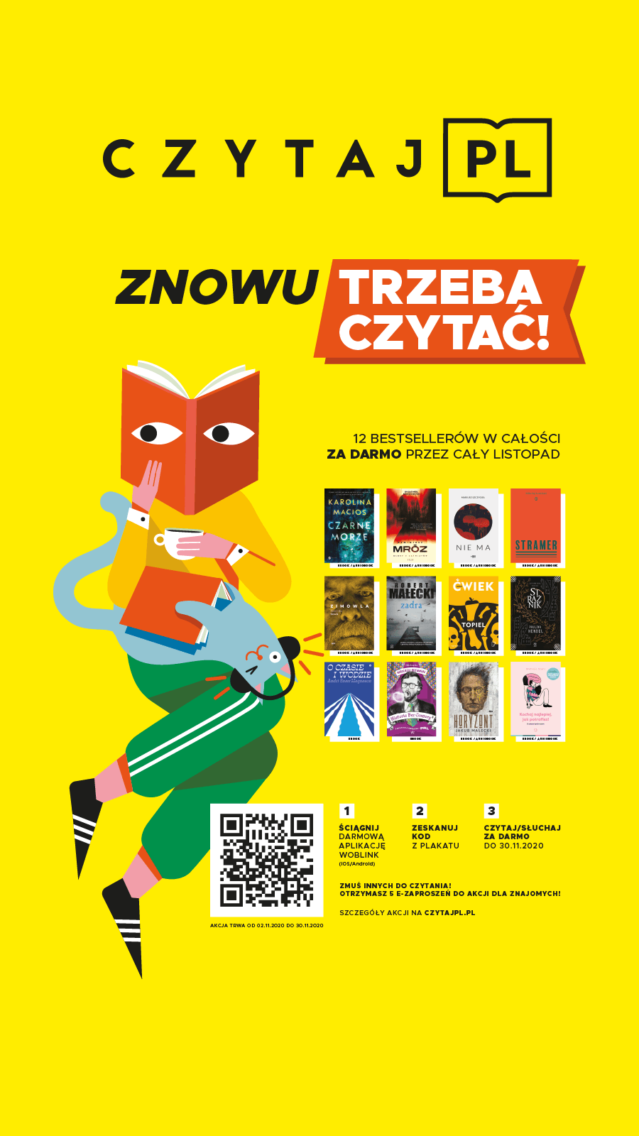 Zapraszamy do wzięcia udziału w największej w Polsce i na świecie tego rodzaju akcji czytelniczej. Czytaj PL powraca i jak co roku ma zamiar mocno zamieszać w czytelniczych statystykach! Selekcja świetnych książek do czytania i do słuchania - w pełni za darmo, do końca listopada. Wystarczy, że pobierzecie aplikację Woblink, zeskanujecie kod QR na stronie https://czytajpl.pl/ i już jesteście u celu. Sami widzicie, nie ma wymówki od czytania.