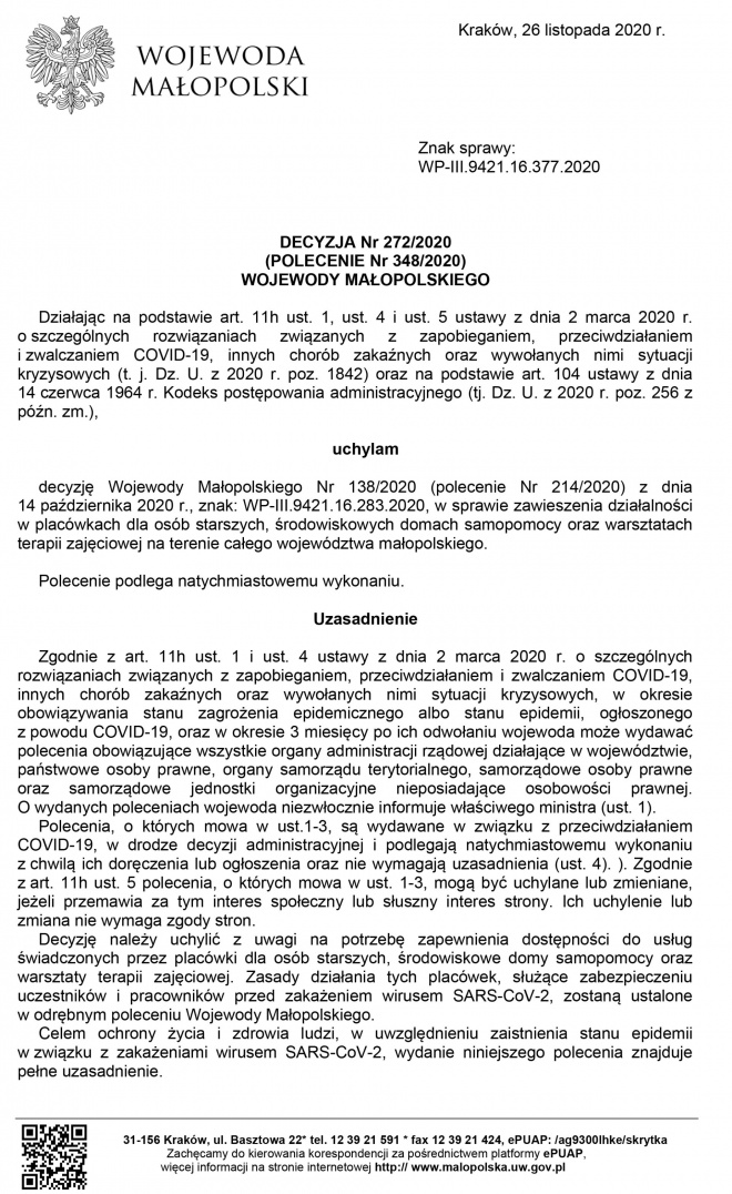 Wojewoda Małopolski wydał Decyzję nr 272/2020 (Polecenie nr 348/2020) w sprawie uchylenia decyzji nr 138/2020 (Polecenie nr 214/2020) Wojewody Małopolskiego z dnia 14 października 2020 roku, znak: WP-III.9421.16.283.2020 skierowaną do wszystkich wójtów, burmistrzów, prezydentów gmin i miast oraz starostów powiatów z obszaru województwa małopolskiego, w sprawie zawieszenia działalności w placówkach dla osób starszych, środowiskowych domach samopomocy oraz warsztatach terapii zajęciowej na terenie całego województwa małopolskiego.